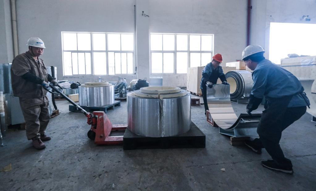 5月2日,在位于浙江省嘉興市秀洲區王店鎮的浙江振申絕熱科技股份有限公司聚氨酯車間內,工人進行管托安裝工序。新華社記者 徐昱 攝
