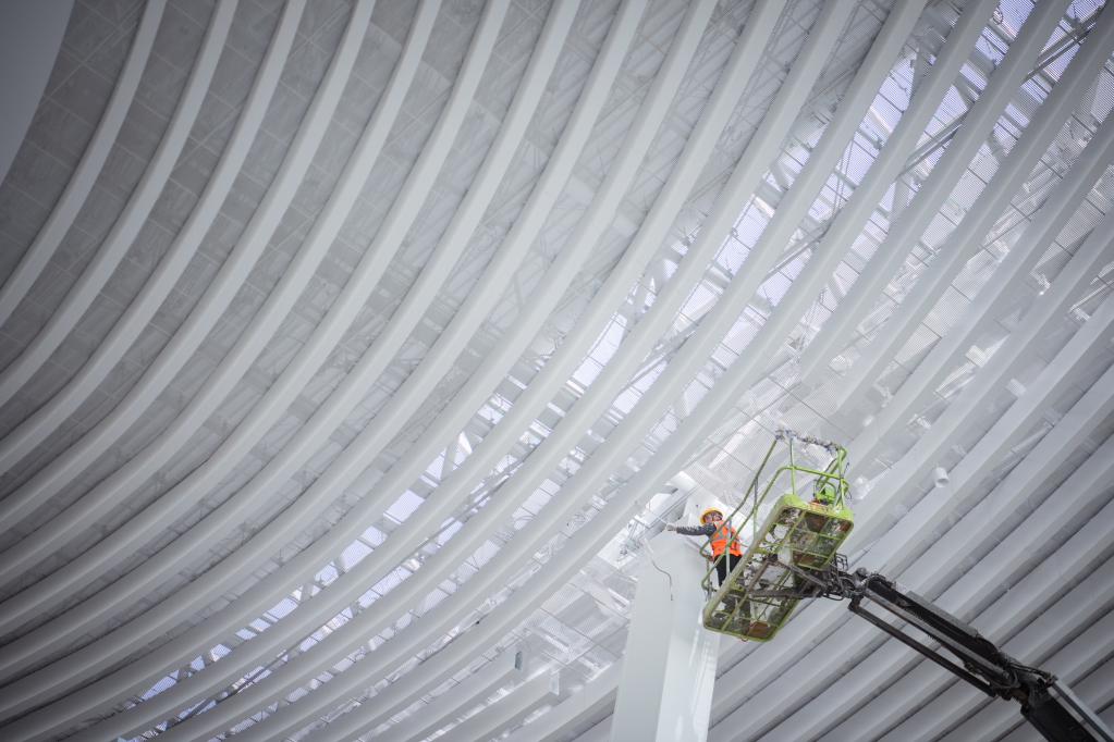 5月1日,在中建三局承建的武漢天河機場T2航站樓改造工程項目工地,工人檢查吊頂內管線。新華社記者 伍志尊 攝