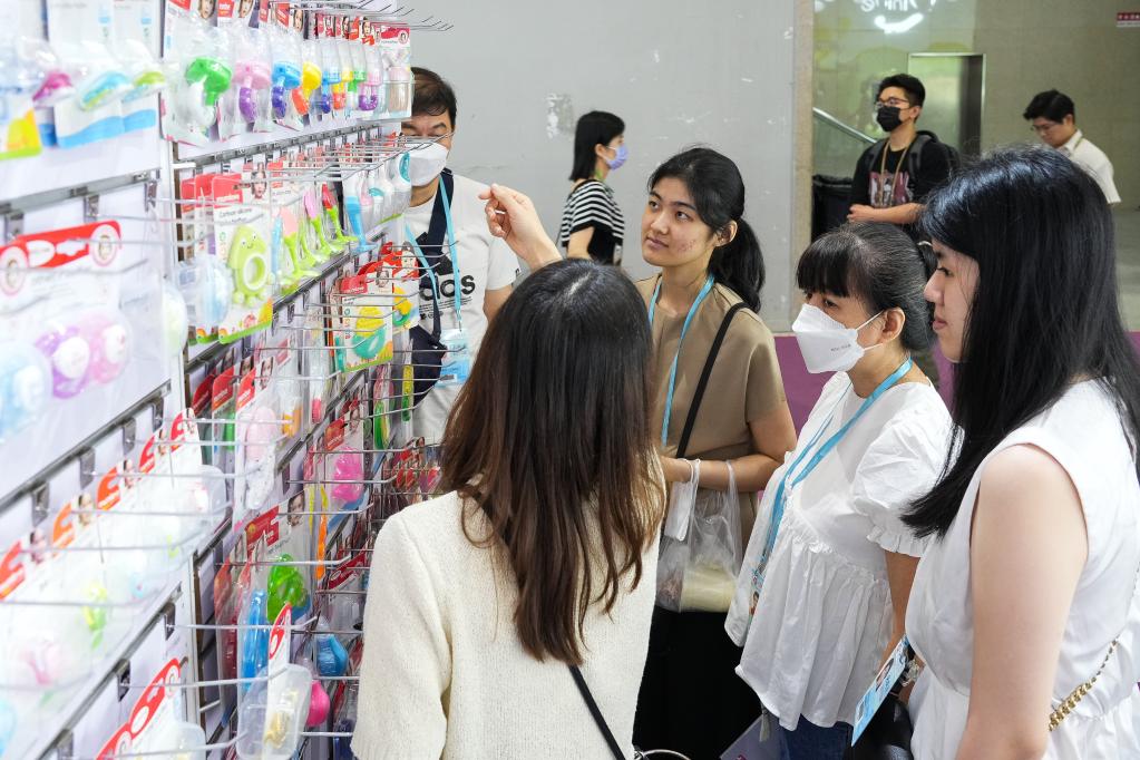 印尼采購商朱麗婭·哈桑(右二)一家四口在第133屆廣交會二期孕嬰童展區了解嬰兒用品(4月23日攝)。新華社記者 劉大偉 攝