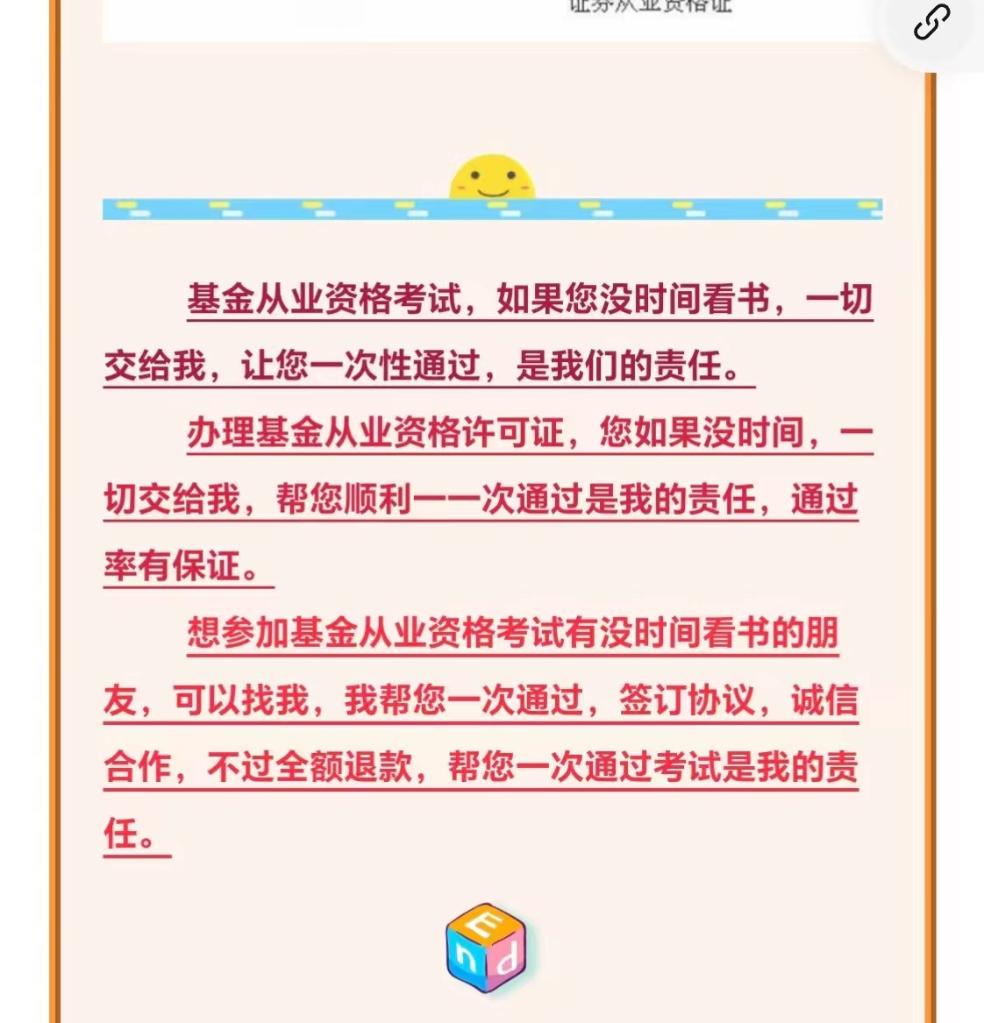 ——“提前透題”純屬誘餌。家住南昌的張小姐在網上找到一家基金從業資格考試培訓機構,對方向其表示有“內部資源”,提供準考證和身份證號碼即可提供“取證名額”。