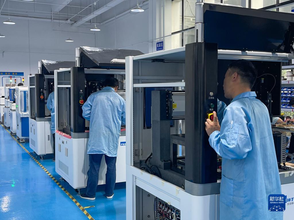 武漢普賽斯電子股份有限公司的生產人員對大功率VCSEL晶圓測試系統進行裝配調試(2023年5月10日攝)。新華社發(鐵藝凝 攝)