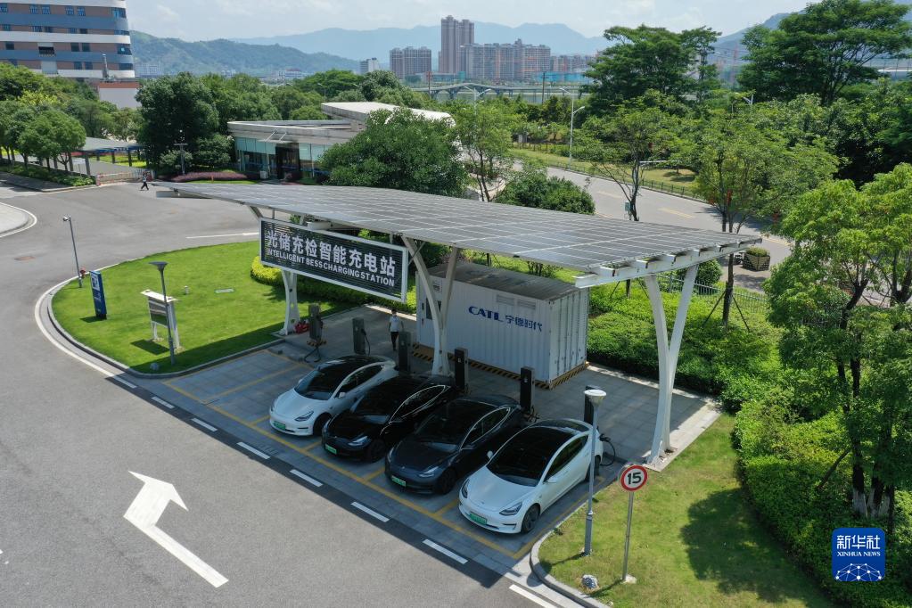 在寧德時代新能源科技股份有限公司科技大樓前拍攝的光儲充檢智能充電站(2022年6月24日攝,無人機照片)。新華社記者 林善傳 攝