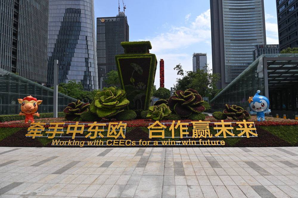 在寧波國際會展中心附近拍攝的第三屆中國—中東歐國家博覽會暨國際消費品博覽會綠化景觀造型(5月16日攝)。新華社記者 黃宗治 攝