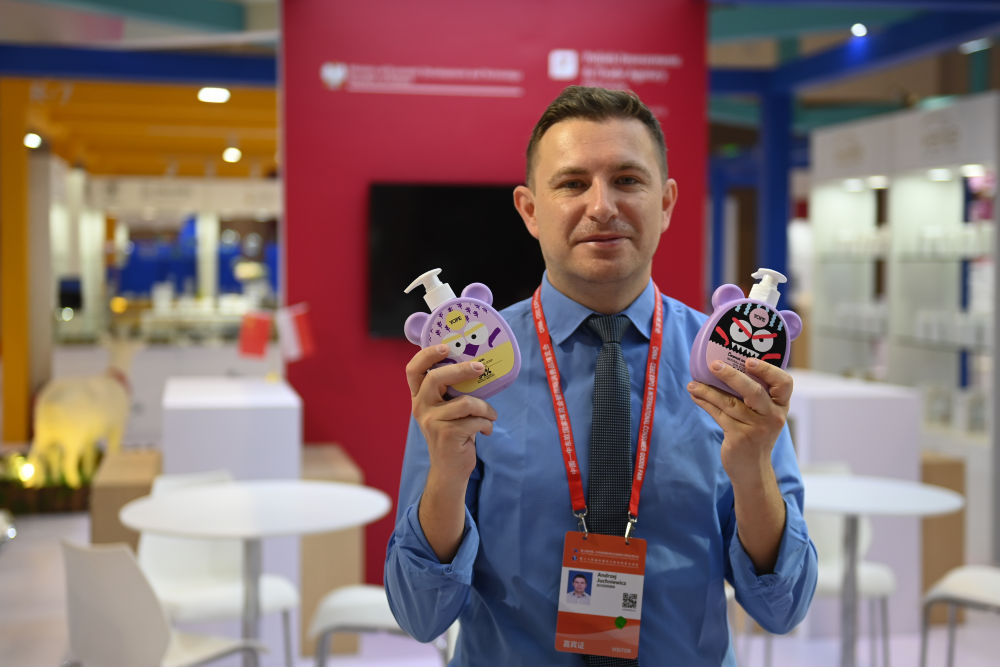 在第三屆中國—中東歐國家博覽會暨國際消費品博覽會中東歐展館,企業代表展示來自波蘭的日用消費品(5月16日攝)。新華社記者 黃宗治 攝
