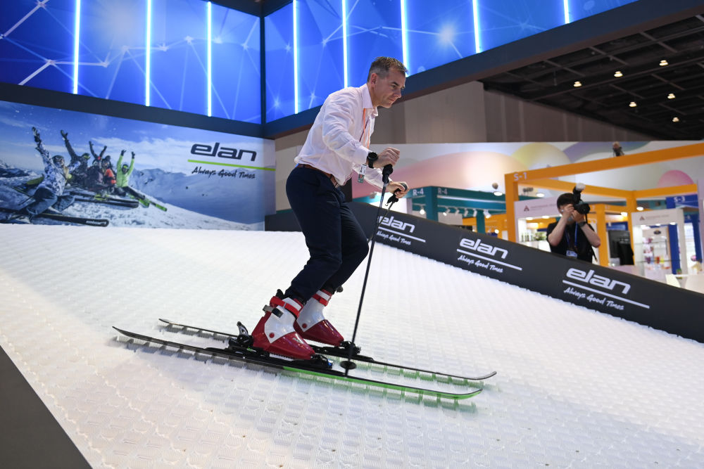 在第三屆中國—中東歐國家博覽會暨國際消費品博覽會中東歐展館,來自斯洛文尼亞的企業代表現場展示雪具產品(5月16日攝)。新華社記者 黃宗治 攝