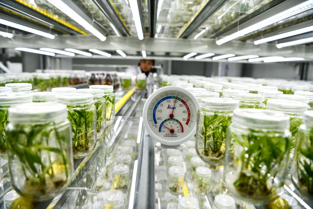 工作人員在貴陽市開陽縣南江蔬菜良種繁育中心的組培中心查看姜苗生長情況(2023年5月23日攝)。新華社記者 楊文斌 攝