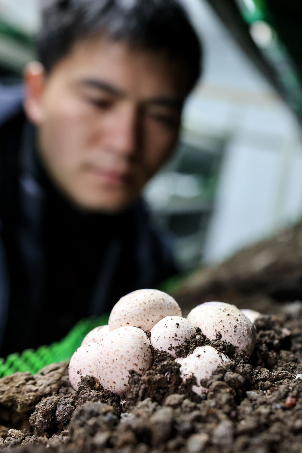工作人員在貴陽市白云區食用菌產業示范園智能菇房內查看菌菇生長情況(2022年2月14日攝)。新華社記者 歐東衢 攝