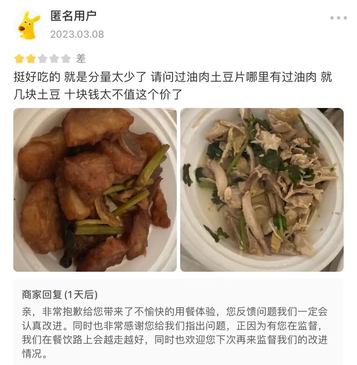 太原市萬象城、親賢街多家餐飲企業經營者表示,“同等條件下,消費者消費大份菜、一份菜價格要低于兩份小份菜、半份菜的價格之和,一些消費者認為不劃算,讓小份菜、半份菜推廣面臨困難?!痹谀惩赓u平臺,記者瀏覽發現,一些給予差評的消費者評價留言稱,小份菜的分量和價格不成正比、“量少價貴”等。