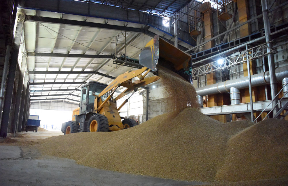 5月30日,在河南省駐馬店市正陽縣大林鎮一家烘干加工合作社,工作人員駕駛車輛將濕麥推入烘干機入料口。新華社記者 郝源 攝