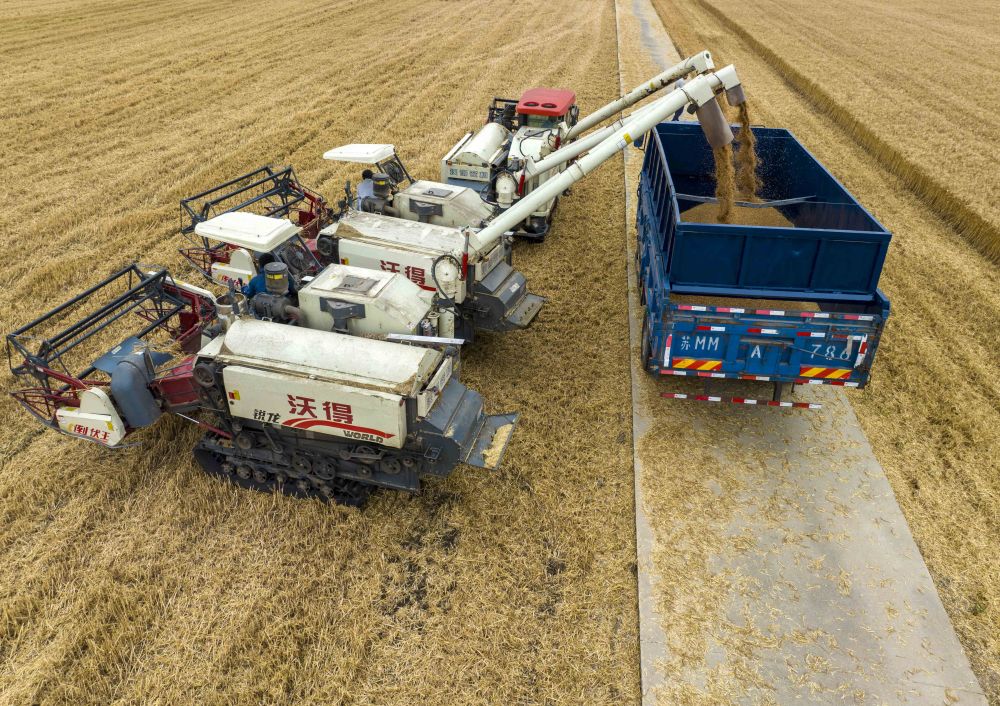 5月30日,在江蘇省泰州市姜堰區顧高鎮塘橋村,農民在田間將小麥裝車(無人機照片)。新華社發(湯德宏 攝)