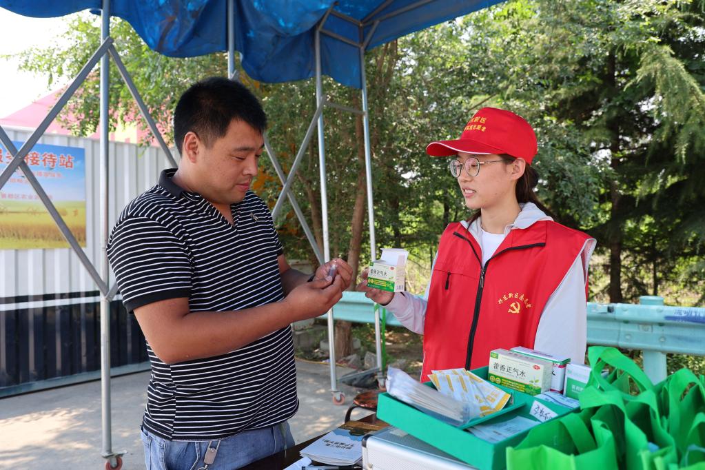 在G4京港澳高速邢臺北口,跨區機收接待服務站工作人員向農機手發放防暑物品。新華社記者 鄒尚伯 攝