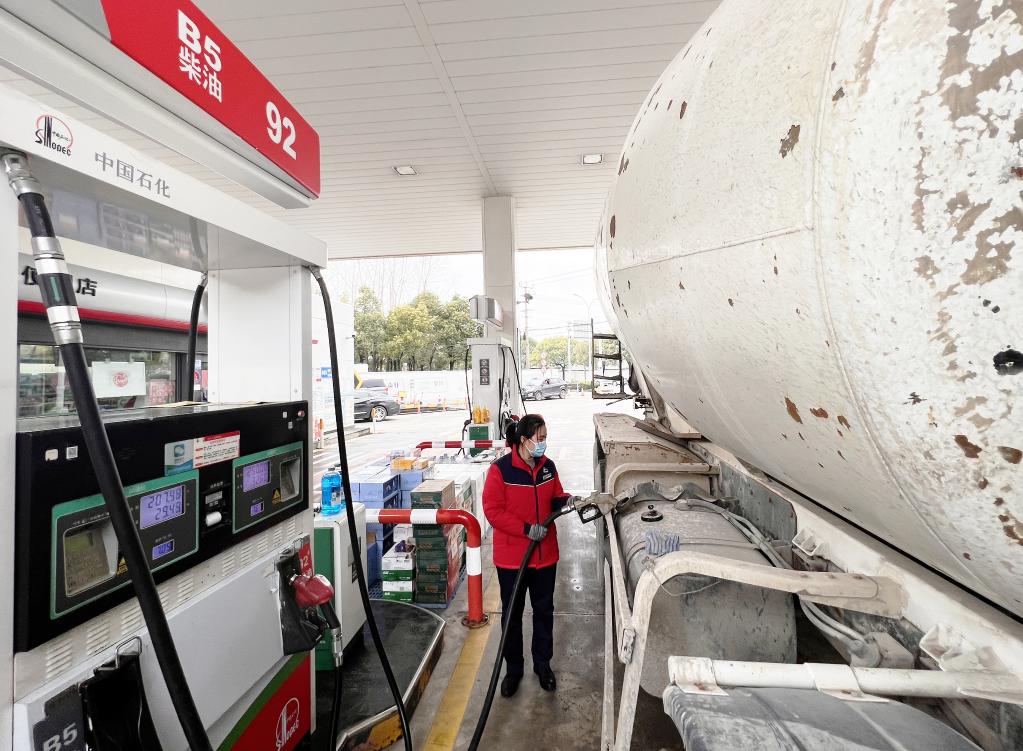 中石化加油站中工作人員正在給車輛加注B5生物柴油。受訪單位供圖