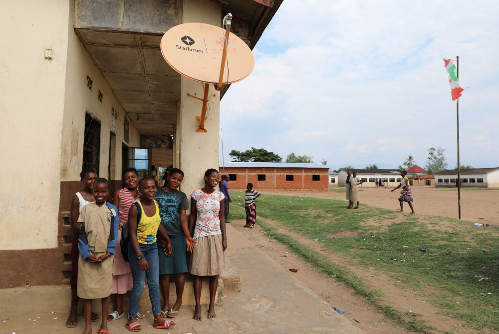 2022年10月31日,在布隆迪布瓊布拉鄉村省穆蒂姆布齊的一座村莊,當地村民與中國援建布隆迪“萬村通”項目安裝的衛星電視接收器合影。新華社記者 董江輝 攝
