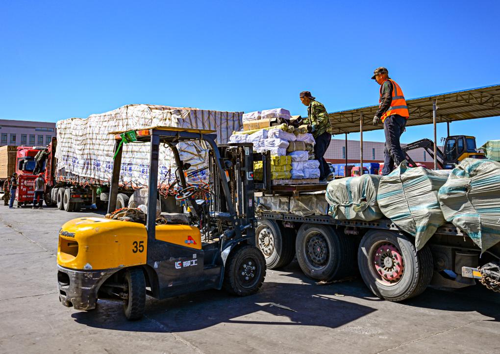 2023年6月11日,工人在二連浩特口岸旁的進出口物流園區中裝載準備出口的貨物。新華社記者 彭源 攝