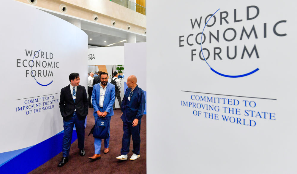 第十四屆夏季達沃斯論壇與會者在論壇設置的新領軍者村內交流(6月27日攝)。新華社記者 孫凡越 攝