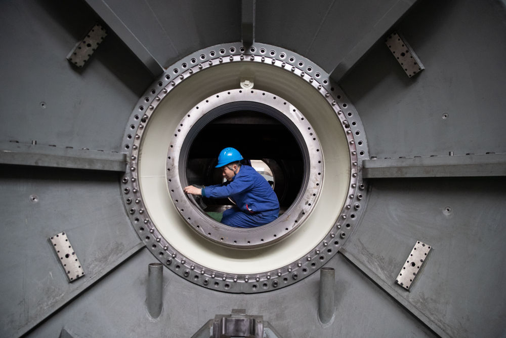 工人在哈電集團哈爾濱汽輪機廠有限責任公司車間內生產作業(4月28日攝)。新華社記者 張濤 攝