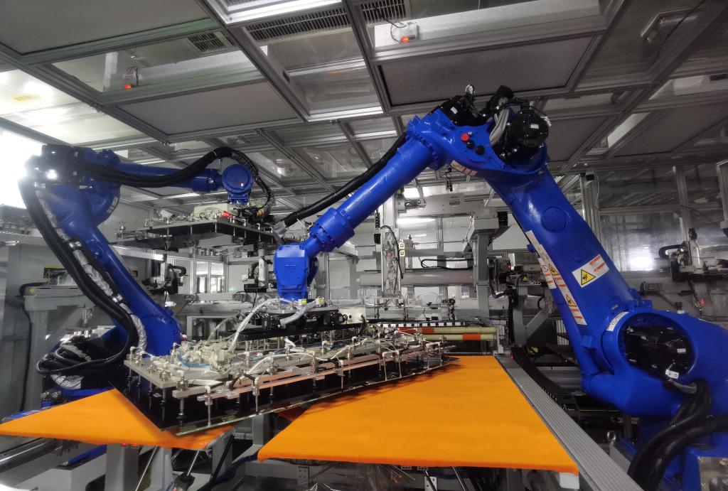 在位于青島的海信視像智能車間生產線上,機器人對液晶面板和背光板自動化精準卡合(6月19日攝)。新華社記者王凱 攝