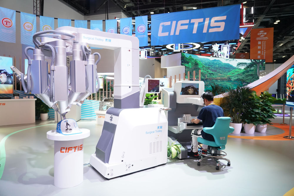 這是9月1日在國家會議中心拍攝的一款單孔腔鏡手術機器人。新華社記者 任超 攝