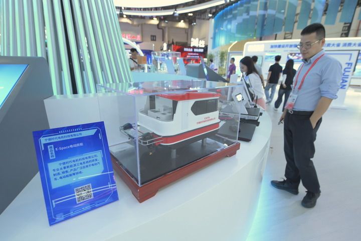 9月8日,參觀者在第二十三屆中國國際投資貿易洽談會展覽上觀看寧德時代電機科技有限公司的電動房船模型。新華社記者 林善傳 攝