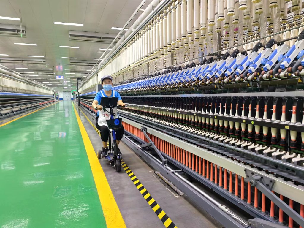 7月14日,山東魏橋創業集團的紡織車間內,一名女工正在巡查紡紗生產線。新華社記者陳灝 攝