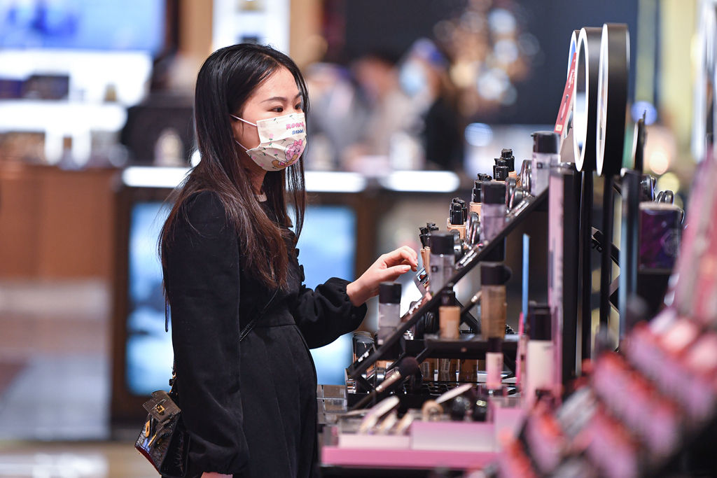 消費者在中免集團??谌赵聫V場免稅店選購化妝品(1月19日攝)。新華社記者 蒲曉旭 攝