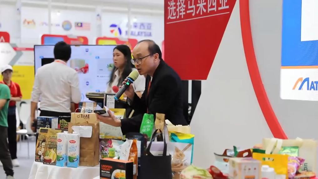 走進馬來西亞館,一場產品推介會正在進行中。馬來西亞參展商姚建祥正在臺上熱情推介一款椰子水。
