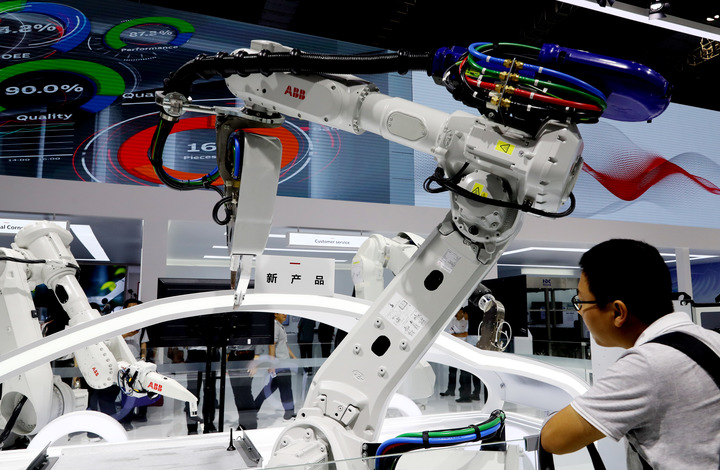 近日在上海舉行的第23屆中國國際工業博覽會上,參觀者在一組ABB機器人靜態展示展品前駐足觀看。新華社記者方喆 攝