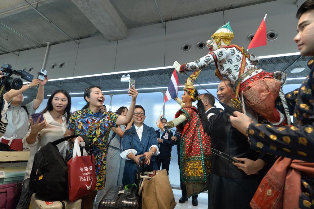 9月25日,工作人員在泰國曼谷素萬那普國際機場迎接中國游客。新華社發(拉亨 攝)