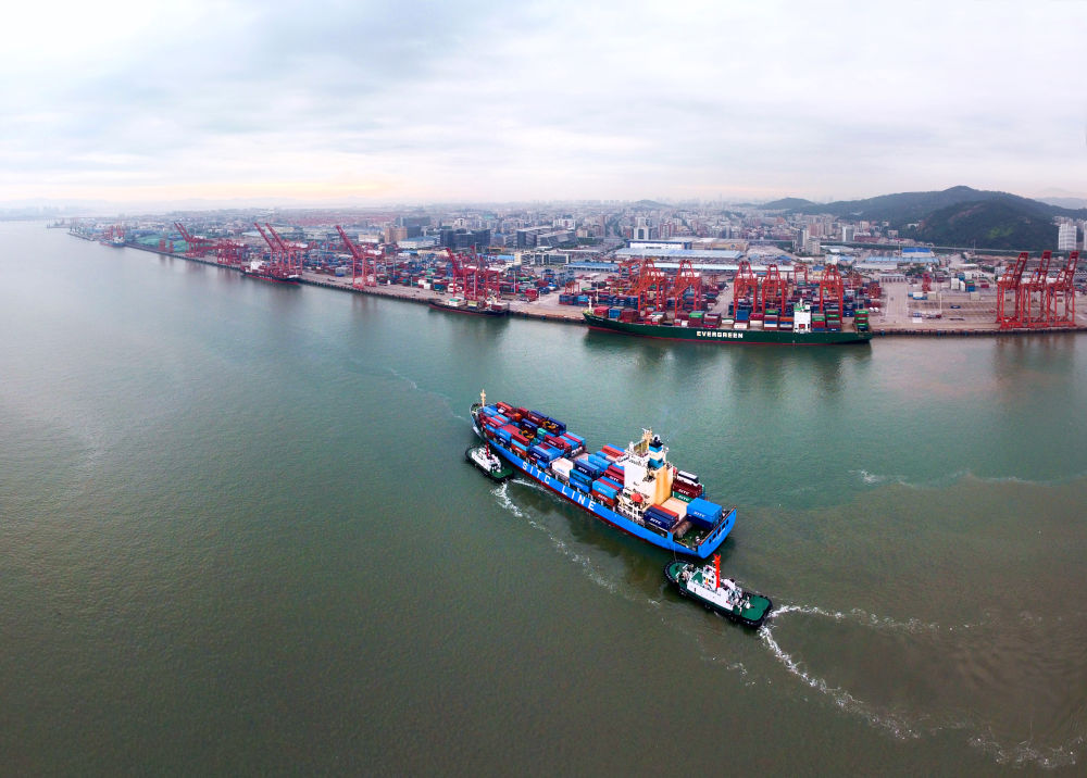 在福建自貿區廈門片區東渡港區,一艘貨輪向碼頭靠攏(2017年8月26日無人機照片)。新華社記者 姜克紅 攝