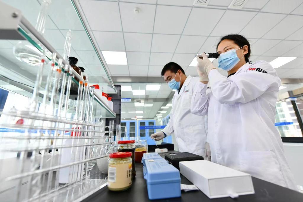 麻辣食品工業數字化研究院中,工作人員正在進行新產品配制試驗。(楊圣龍 攝)