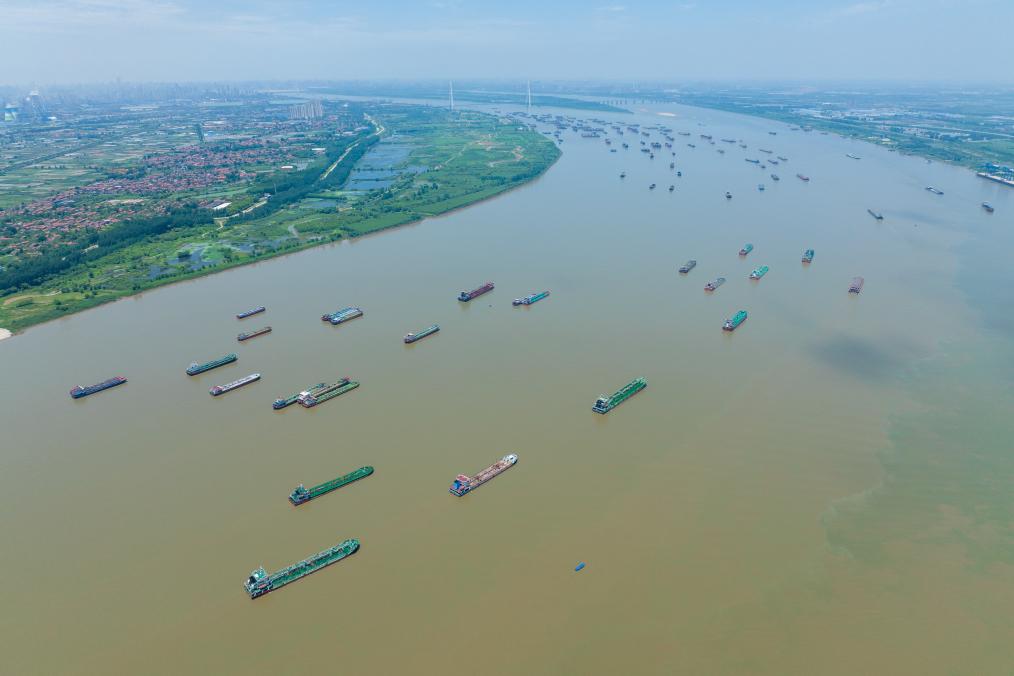 7月5日,船舶在武漢陽邏港區水域行駛(無人機照片)。新華社記者伍志尊 攝