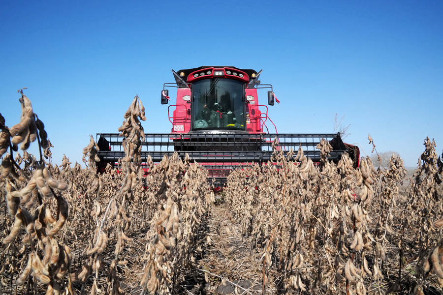 收割機在黑龍江省富錦市一大豆地塊收獲大豆(2023年10月11日攝)。新華社記者 王建威 攝