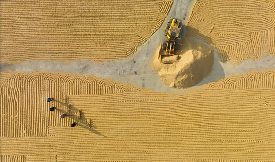 在遼寧省燈塔市禾谷茂源水稻種植專業合作社,農民在晾曬收獲的水稻(2023年10月12日攝,無人機照片)。新華社記者 楊青 攝