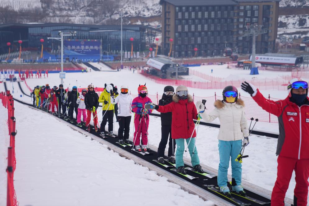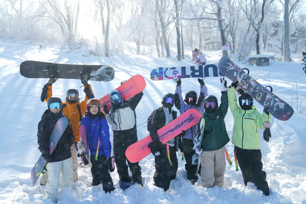 2023年11月18日,參加吉林省新雪季“開板首滑”活動的滑雪愛好者在吉林市萬科松花湖度假區合影留念。