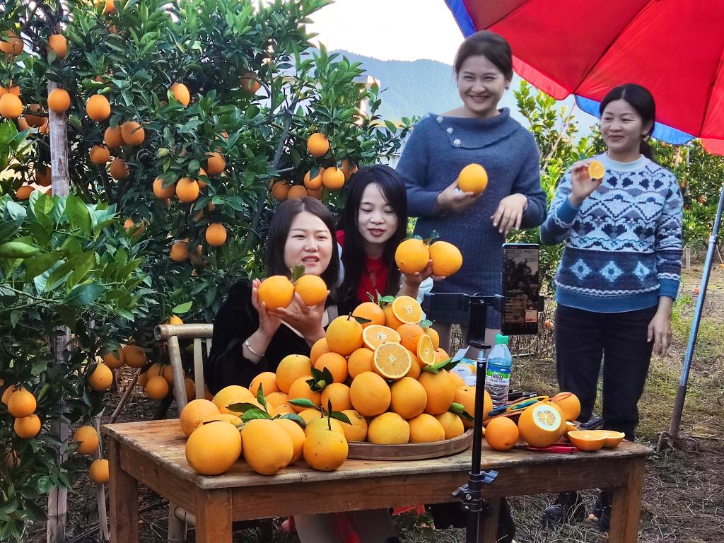 “身后是我自己家的臍橙園,保證您的橙子都是新鮮采摘、當天發貨?!毙咆S縣果農殷春梅對著手機正向觀眾直播。