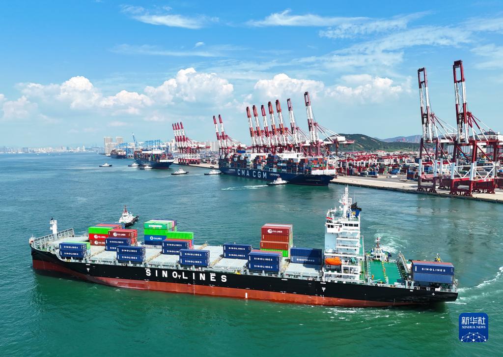 一艘貨輪緩緩駛離山東港口青島港(無人機照片,2023年8月30日攝)。新華社發(張進剛 攝)