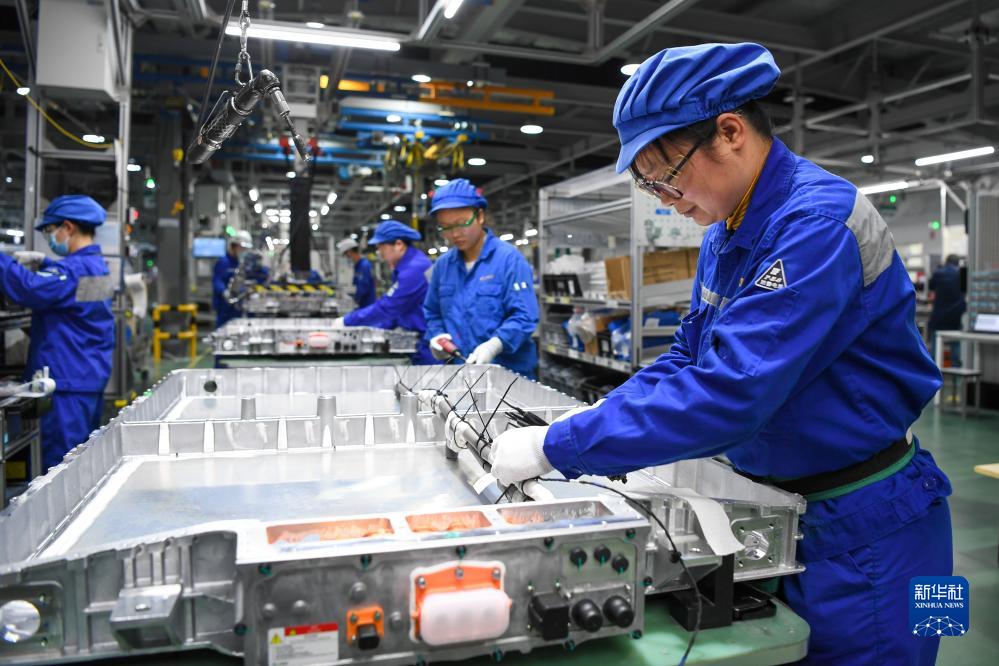 在位于江蘇常州溧陽的上汽時代動力電池系統有限公司,工人在車間進行電池生產(2023年2月16日攝)。新華社記者 李博 攝