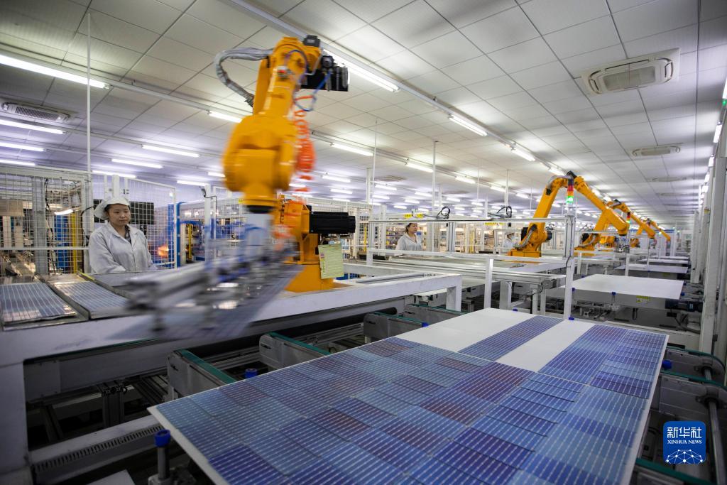 在山東省東營市廣饒縣的東營大??屏止怆娪邢薰局悄芑柲芙M件生產車間,工人在調試設備,生產出口的光伏組件(2023年2月24日攝)。新華社發(劉云杰 攝)