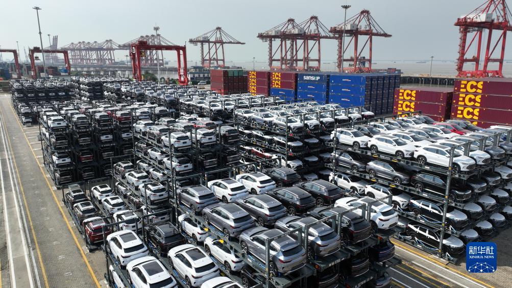 在江蘇省太倉港國際集裝箱碼頭,一批新能源汽車即將通過專用框架運輸方式出口(無人機全景照片,2023年7月11日攝)。新華社發(計海新 攝)
