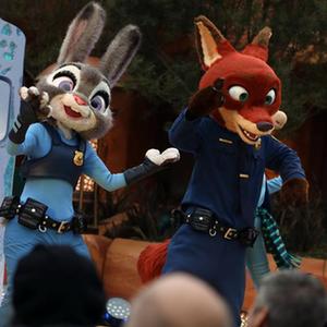 12月19日,在上海迪士尼樂園“瘋狂動物城”開“城”儀式上,“狐貍尼克”和“兔子警官朱迪”亮相。新華社記者 劉穎 攝