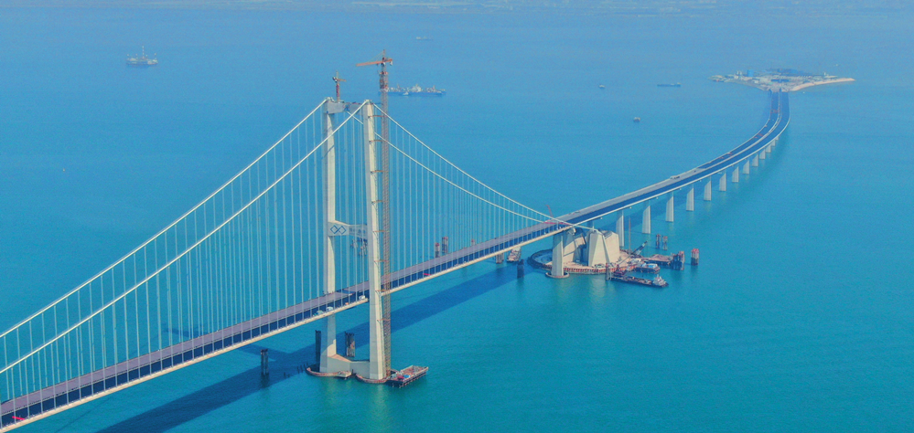 粵港澳大灣區超級工程深中通道主線正式貫通,圖為深中通道伶仃洋大橋東塔及西人工島(2023 年 11 月 28 日攝)鄧華攝 / 本刊