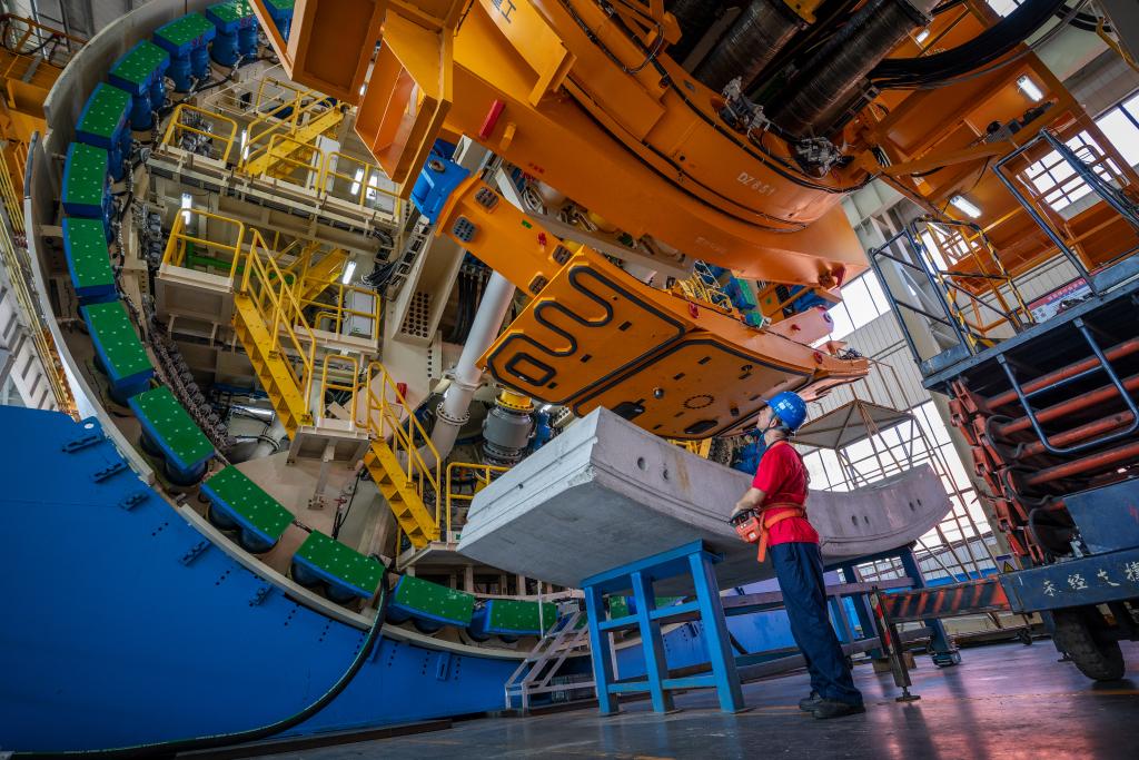 鐵建重工生產車間內,工人正在對盾構機進行安裝調試。(資料圖片)