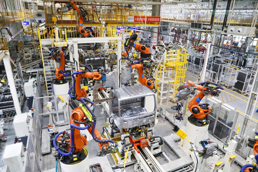 在北汽福田位于長沙的超級卡車工廠里,車頭的焊接工作全部由機械臂自動完成。(資料圖片)