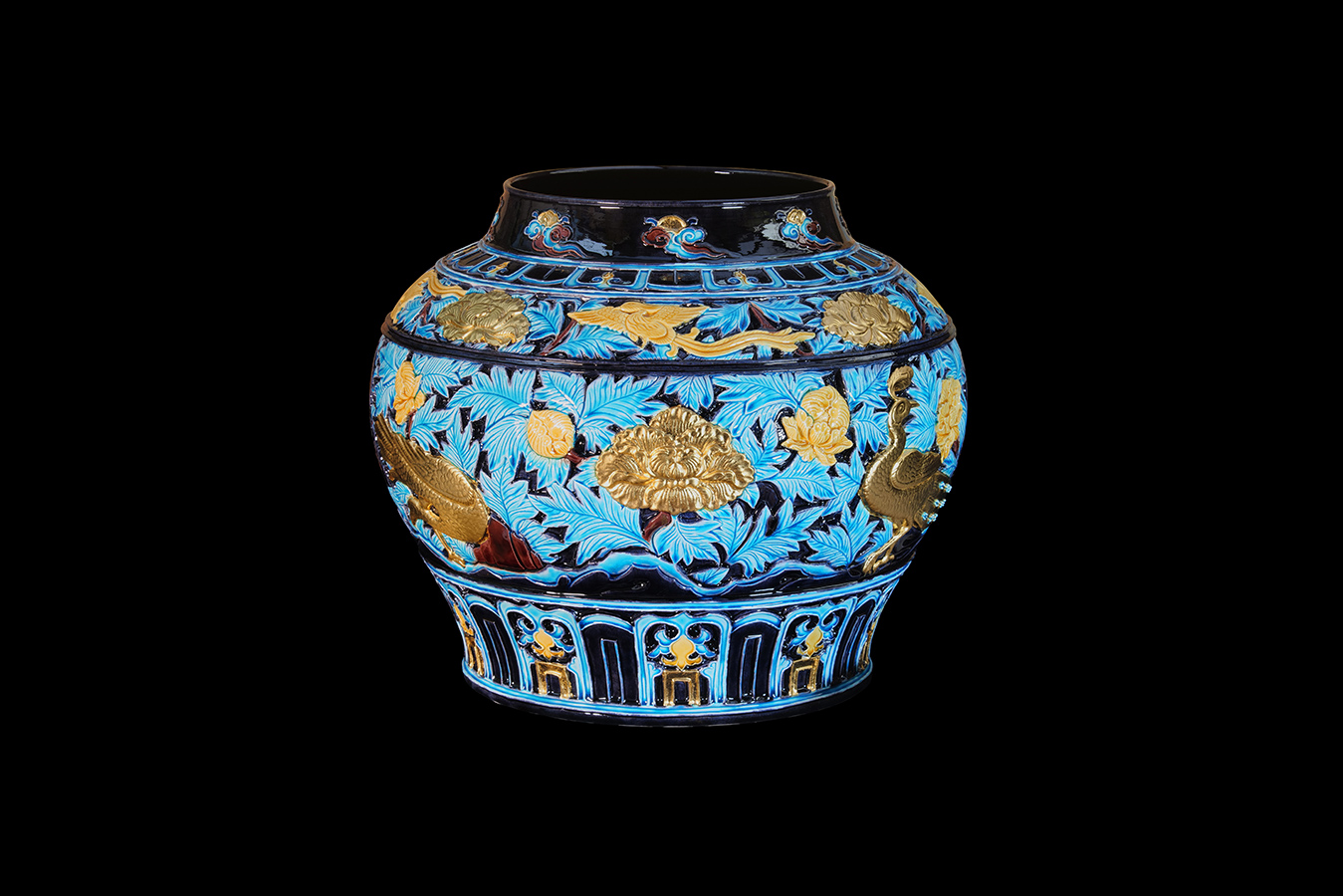 琺華鳳鳥牡丹紋剔刻貼金大罐