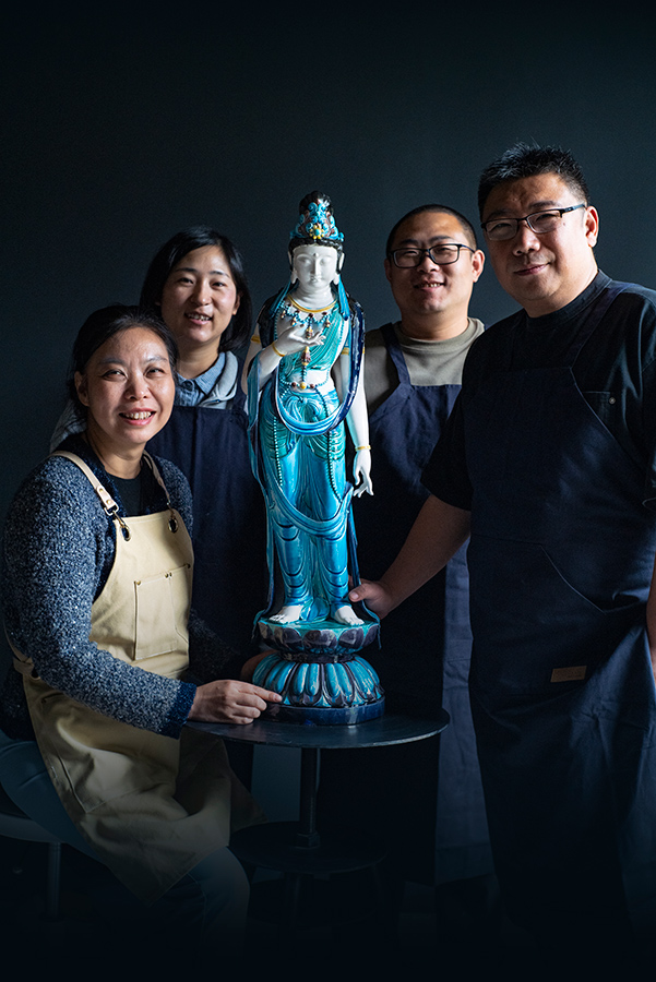 藝術家于山(右一)、林存真(左一)與“朝元窯”匠師李秀艷(左二)、李秀龍(右二)
