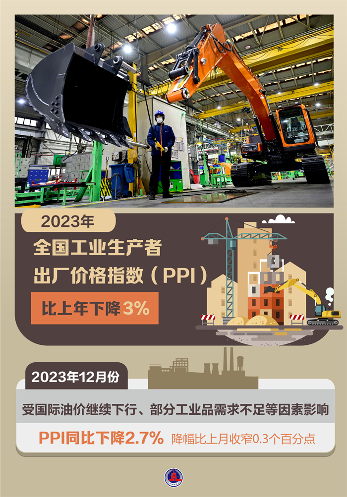 2023年全年,全國工業生產者出廠價格指數(PPI)比上年下降3%。其中,受國際油價繼續下行、部分工業品需求不足等因素影響,2023年12月份,PPI同比下降2.7%,降幅比上月收窄0.3個百分點;環比下降0.3%,降幅與上月相同。