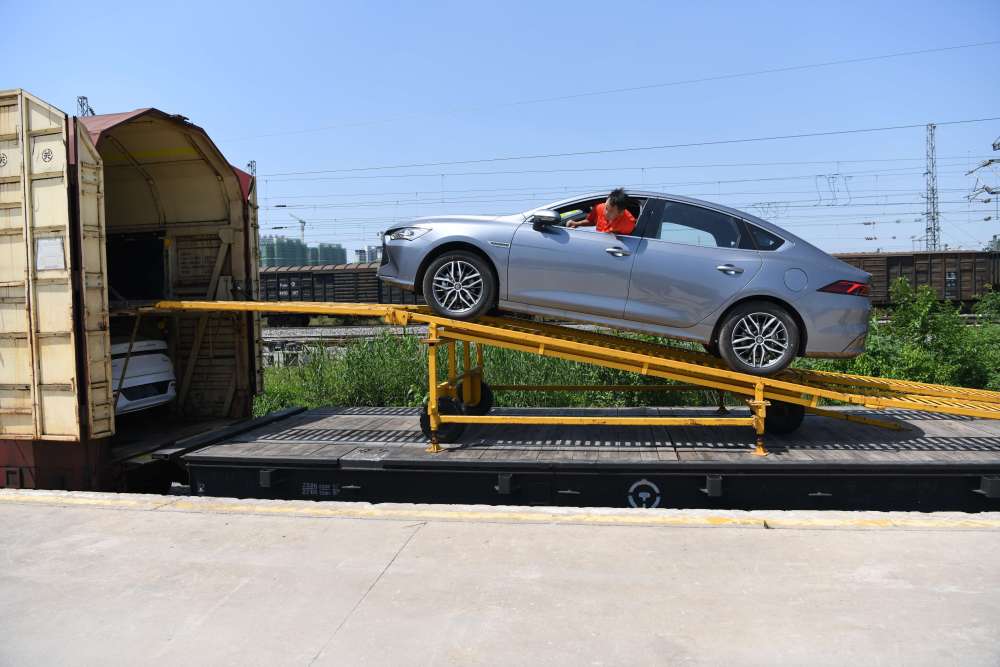 2023年5月9日,在中國鐵路上海局集團有限公司淮南西站水家湖貨運站,工作人員裝運新能源汽車。新華社記者 劉軍喜 攝