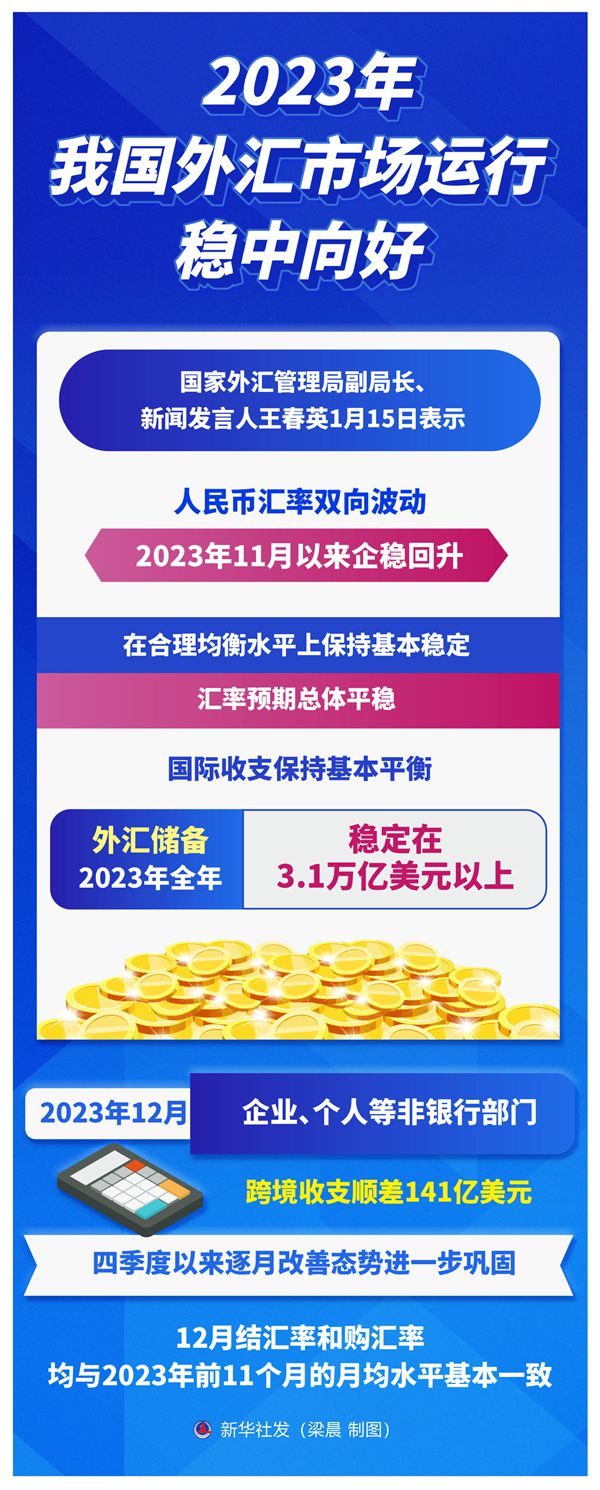 新華社北京1月15日電(記者劉開雄)“2023年我國外匯市場運行穩中向好、表現出較強韌性?!眹彝鈪R管理局副局長、新聞發言人王春英15日表示,人民幣匯率雙向波動,2023年11月以來企穩回升,在合理均衡水平上保持基本穩定,匯率預期總體平穩;國際收支保持基本平衡,外匯儲備2023年全年穩定在3.1萬億美元以上。