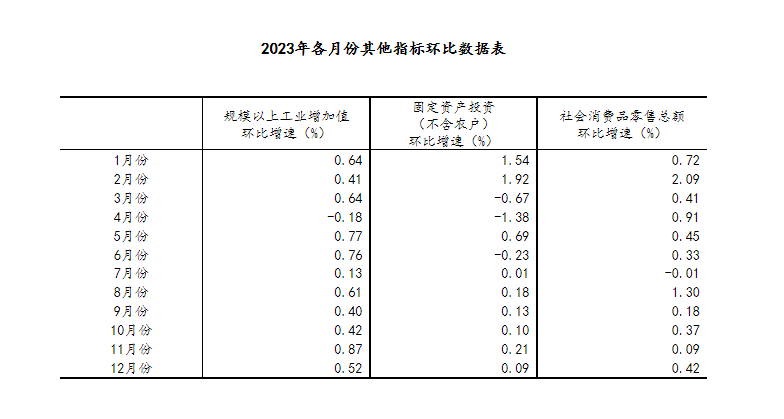 (2)根據季節調整模型自動修正結果,對近一年來各期國內生產總值、規模以上工業增加值、固定資產投資(不含農戶)、社會消費品零售總額環比增速進行修訂。修訂結果及2023年四季度GDP環比數據、2023年12月份其他指標環比數據如下: