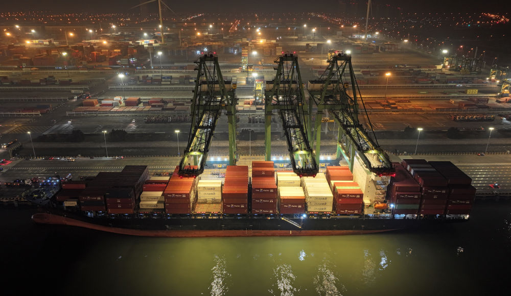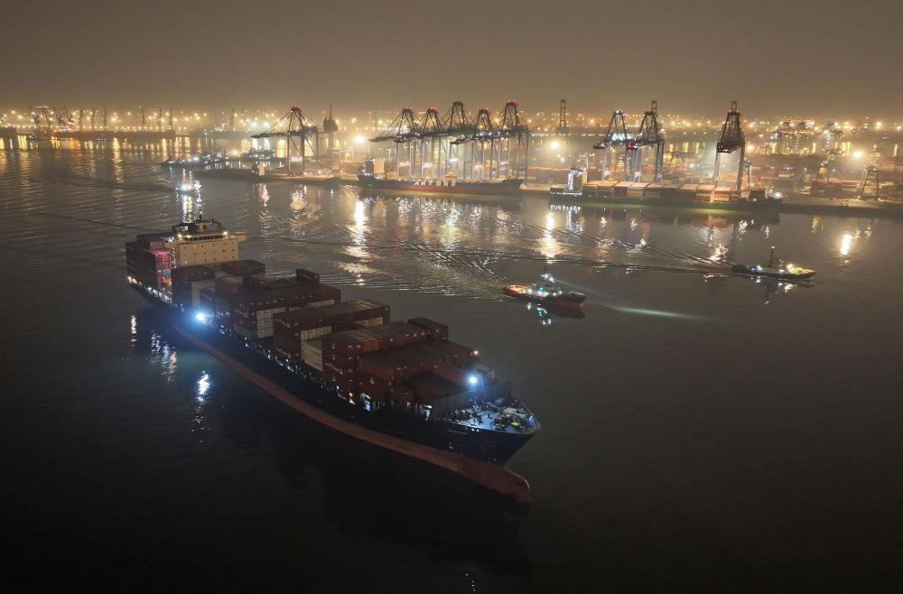 ↑大型集裝箱班輪“巴赫”號駛入天津港碼頭(無人機照片)